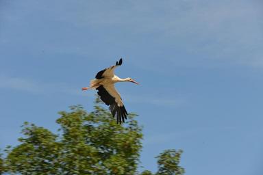 Keywords: stork bird animal rattle stork nature white stork fly sky stork village blue summer nest landing roof idyllic tree leaves crown