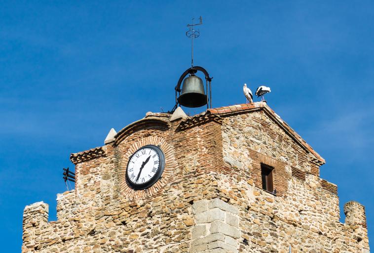 Keywords: stork people bell tower clock campaign hour facade cathedral city sky old building peace stone the clock tower building spain tower church