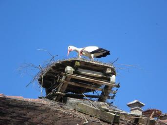 Keywords: stork rattle stork rattle storks pair two breed nest storchennest roof house roof home spring sky blue high above top