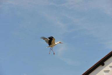 Keywords: stork white stork rattle stork nature fly sky stork village blue summer nest landing roof idyllic tree leaves bird animals crown
