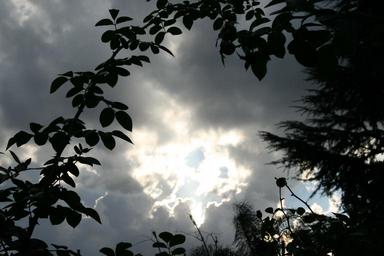 Keywords: storm sky clouds building thunderstorm silhouette weather light coming through framed by foliage