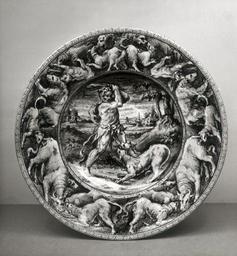 | Keywords: Stradanus - Dish with Hercules Overcoming Cerberus - Walters 481330.jpg Hercules captured Cerberus the vicious three-headed dog who guards the entrance to the underworld as the last of his twelve Labors Stradanus arrived in Florence in 1546 and for much of his career worked on commissions for various members of the Medici family principally as a painter He also produced a large number of drawings with hunting scenes for tapestries and for engravings as well as a small number for ceramics Here the fluid expressive style and use of a blue that he employed in his drawings on paper suggest that he drew directly on the dish The initials C D on the back must be those of the master of the workshop where the plate was produced possibly in or near Florence between 1560 1590 Renaissance earthenware with tin glaze maiolica cm 5 3 33 2 accession number 48 1330 11508 H Wencke Collection Hamburg date and mode of acquisition unknown Henry Walters city Baltimore Walters Art Museum Henry Walters Acquired by Henry Walters 1908 initials place of origin Florence Italy Walters Art Museum license Italian Renaissance maiolica in the Walters Art Museum Jan van der Straet Media contributed by the Walters Art Museum needs category review Florence maiolica Capture of Cerberus |