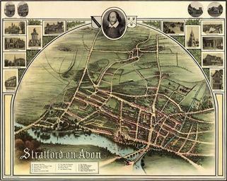 | Keywords: Stratford On Avon historic map 1902.jpg Image title Stratford On Avon Source Stratford on Avon A bird ™s-eye view of Stratford-on-Avon made by J Ross Brown in or about 1908 It is not to scale Place shown Stratford Warwickshire England Keywords maps colour Status public domain hence royalty-free stock image for all purposes and no usage credit required Filename Stratford-on-Avon-q75-500x399 jpg Notes A bird ™s-eye view of Stratford-on-Avon made by J Ross Brown in or about 1908 It is not to scale The key at the bottom left lists the following A Shakespeare ™s Birth Place B Holy Trinity Church Shakespeare ™s Tomb C Shakespeare ™s Home New Place D Harvard house E Shakespeare ™s Inn and Five Gables F The Golden Bee Restaurant G Guild Chapel and School H Memorial Theatre I Ann Hathaway ™s Cottage 1 The Vicarage 2 Marie Correlli ™s Residence 3 Golden bee restaurant 4 White Swan Hotel 5 Fountain Restaurant 6 Swan ™s Nest hotel Boating House 7 Glencoe Cottage Arden St There are photographs around the top edges of the map which include Smith ™s Variety Store Golden Bee Memorial theatre Shakespeare Hotel Holy Trinity Chirch mar Correlli ™s House Gower ™s Monument Ann Hathaway ™s Cottage Guild Chapel School White Swan Hotel The Clopton Bridge Memorial Fountain View from Tower of Theatre The Birth Room Shakespeare ™s Birthplace and Harvard House This image originally came from the public domain images at the Library of Congress; it is http //hdl loc gov/loc gmd/g5754s ct000162 I Liam have scaled it down and converted it to JPEG; I also improved the way that multiple scans had been joined so that the seams were less obvious I will distribute the higher resolution image on request Dimensions 490 x 660mm 19 3 x 26 0 inches Source http //www fromoldbooks org/RossBrown-Stratford/ PD-old Old maps of cities in England Shakespeare's Life Maps of Warwickshire Stratford-upon-Avon Maps of literature |