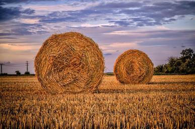 Keywords: straw bale field nature rural landscape agriculture plants meadow dry summer harvest blue sky landscape bale straw sunset