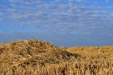 Keywords: straw field stubble sky contrast blue clouds summer agriculture landscape background pile of straw