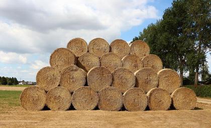 Keywords: straw straw bales field stubble round bales summer agriculture hay straw role hay bales rolled harvested landscape sky clouds
