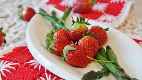Keywords: strawberries sweet red delicious ripe fruity fruit asparagus green asparagus green vitamins healthy vegetarian vegan strawberry fruit food