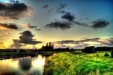 Keywords: stream river quiet tranquil reflection evening twilight nature outdoors sunset sky dawn clouds water grass field landscape