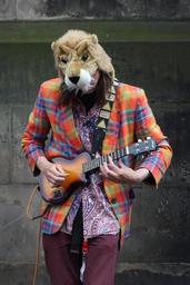 Keywords: street musician instrument player artist guitar song blues city retro fun art concert performer show head animal