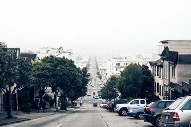 Keywords: street road cars urban city residential area traffic cityscape transportation asphalt concrete houses slope hill trees exposure bright