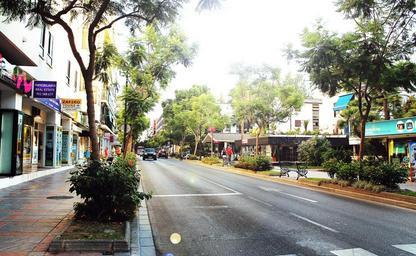 Keywords: street road green spain city cities travel sidewalk stores shops trees urban