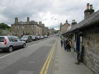 Keywords: street road road marking perspective distance shopping distortion pavement sidewalk paved paving footpath old street city town old village dull grey gray outdoors morning