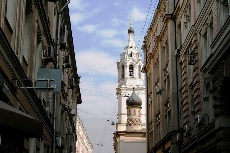 Keywords: street scene historic old arbat erect buildings shaded church white bell tower cupola sky clouds