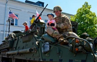 | Keywords: outdoor Specialist Marius Siauciunas, native of Kaunus, Lithuania and gunner for 4th Squadron, 2nd Calvary Regiment takes a photo with a young Polish girl in the main square of Suwalki, Poland, June 4, as part of joint static display and civilian-military engagement. Citizens were able to meet Soldiers and see military equipment as well as witness the exchange of thanks between U.S. and Polish leaders. Approximately 1,400 Soldiers, in 400 vehicles, will be covering over 2,200 kilometers, through six countries Soldiers, beginning at Rose Barracks, Germany and Journeying through Poland as part of Exercise Dragoon Ride. Also happening in Poland will be Exercise Anakonda 16, a premier training event for U.S. Army Europe and participating nations and demonstrates that the U.S. and partner nations can effectively unite together under a unified command while training on a contemporary scenario. (U.S. Army photo by: Sgt. Caitlyn Byrne) Specialist Marius Siauciunas, native of Kaunus, Lithuania and gunner for 4th Squadron, 2nd Calvary Regiment takes a photo with a young Polish girl in the main square of Suwalki, Poland, June 4, as part of joint static display and civilian-military engagement. Citizens were able to meet Soldiers and see military equipment as well as witness the exchange of thanks between U.S. and Polish leaders. Approximately 1,400 Soldiers, in 400 vehicles, will be covering over 2,200 kilometers, through six countries Soldiers, beginning at Rose Barracks, Germany and Journeying through Poland as part of Exercise Dragoon Ride. Also happening in Poland will be Exercise Anakonda 16, a premier training event for U.S. Army Europe and participating nations and demonstrates that the U.S. and partner nations can effectively unite together under a unified command while training on a contemporary scenario. (U.S. Army photo by: Sgt. Caitlyn Byrne) |