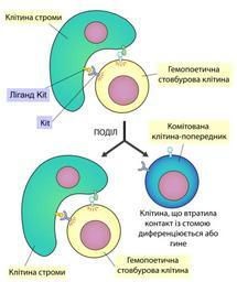 | Keywords: Stroma in haematopoiesis.svg uk Залежність гемопоетичної стовбу ової клітин від контакту із ст омальною клітиною Сп ощена схема взаємодії між гемоцитобластом та ст омальною клітиною остеобластом Взаємодія відбувається за участі ецепто ної ти озин кінази Kit на пове хні гемоцитобласта та її ліганда на пове хні ст омальної клітини Якщо гемоцитобласт вт ачає контакт із стомою він змушений дифе енціюватись або загинути шляхом апоптозу П оте невелика кількість функціональних к овотві них стовбу ових клітин може бути знайдена і у вільому стані в к ові 2011-06-09 own Zlir'a cc-zero Uploaded with UploadWizard Hematopoietic stem cells Hematopoiesis |