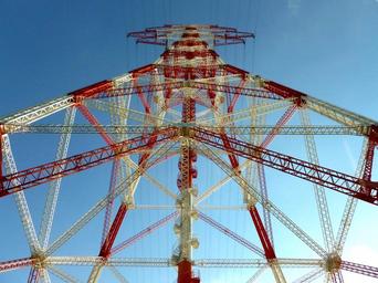 Keywords: strommast landline river crossing energy current power supply high voltage power line power poles electricity pylon line upper lines sun blue white red landscape format