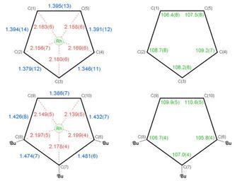 | Keywords: Structure of cation of ((C5tBu3H2)Rh(C5H5))BF4.png This figure is based on data presented in the following paper and also provided in its supplementary materials document Part of the diagram is adapted from a Figure 4 in that paper the rest is my own work It was prepared using Microsoft PowerPoint 2003 Given that the data themselves are not copyright I realise the diagram into the public domain en wikipedia 2011-02-06 EdChem wikipedia en EdChem wikipedia en Cc-zero Original upload log page en wikipedia Structure_of_cation_of_ 28 28C5tBu3H2 29Rh 28C5H5 29 29BF4 png 2011-02-06 16 46 EdChem 960×720× 20755 bytes <nowiki>This figure is based on data presented in the following paper and also provided in its supplementary materials document cite journal Rhodocenium Complexes Bearing the 1 2 3-Tri-tert-butylcyclopentadienyl Ligand Redox-Promoted Synthesis a</nowiki> Rhodocene |