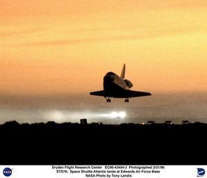 | Keywords: STS-76 Landing - Space Shuttle Atlantis Lands at Edwards Air Force Base DVIDS703178.jpg en The space shuttle Atlantis prepares to touch down on the runway at Edwards California at approximately 5 29 a m Pacific Standard Time after completing the highly successful STS-76 mission to deliver Astronaut Shannon Lucid to the Russian Space Station Mir Lucid was the first American woman to serve as a Mir station researcher Atlantis was originally scheduled to land at Kennedy Space Center Florida but bad weather there both 30 March and 31 March necessitated a landing at the backup site at Edwards on the latter date Mission commander for STS-76 was Kevin P Chilton and Richard A Searfoss was the pilot Ronald M Sega was the payload commander and mission specialist-1 Other mission specialists were Richard Clifford Linda Godwin and Shannon Lucid The mission also featured a spacewalk while Atlantis was docked to Mir and experiments aboard the SPACEHAB module Space Shuttles are the main element of America's Space Transportation System and are used for space research and other space applications The shuttles are the first vehicles capable of being launched into space and returning to Earth on a routine basis Space Shuttles are used as orbiting laboratories in which scientists and mission specialists conduct a wide variety of scientific experiments Crews aboard shuttles place satellites in orbit rendezvous with satellites to carry out repair missions and return them to space and retrieve satellites and return them to Earth for refurbishment and reuse Space Shuttles are true aerospace vehicles They leave Earth and its atmosphere under rocket power provided by three liquid-propellant main engines with two solid-propellant boosters attached plus an external liquid-fuel tank After their orbital missions they streak back through the atmosphere and land like airplanes The returning shuttles however land like gliders without power and on runways Other rockets can place heavy payloads into orbit but they can only be used once Space Shuttles are designed to be continually reused When Space Shuttles are used to transport complete scientific laboratories into space the laboratories remain inside the payload bay throughout the mission They are then removed after the Space Shuttle returns to Earth and can be reused on future flights Some of these orbital laboratories like the Spacelab provide facilities for several specialists to conduct experiments in such fields as medicine astronomy and materials manufacturing Some types of satellites deployed by Space Shuttles include those involved in environmental and resources protection astronomy weather forecasting navigation oceanographic studies and other scientific fields The Space Shuttles can also launch spacecraft into orbits higher than the Shuttle's altitude limit through the use of Inertial Upper Stage IUS propulsion units After release from the Space Shuttle payload bay the IUS is ignited to carry the spacecraft into deep space The Space Shuttles are also being used to carry elements of the International Space Station into space where they are assembled in orbit The Space Shuttles were built by Rockwell International's Space Transportation Systems Division Downey California Rockwell's Rocketdyne Division now part of Boeing builds the three main engines and Thiokol Brigham City Utah makes the solid rocket booster motors Martin Marietta Corporation now Lockheed Martin New Orleans Louisiana makes the external tanks Each orbiter Space Shuttle is 121 feet long has a wingspan of 78 feet and a height of 57 feet The Space Shuttle is approximately the size of a DC-9 commercial airliner and can carry a payload of 65 000 pounds into orbit The payload bay is 60 feet long and 15 feet in diameter Each main engine is capable of producing a sea level thrust of 375 000 pounds and a vacuum orbital thrust of 470 000 pounds The engines burn a mixture of liquid oxygen and liquid hydrogen In orbit the Space Shuttles circle the earth at a speed of 17 500 miles per hour with each orbit taking about 90 minutes A Space Shuttle crew sees a sunrise or sunset every 45 minutes When Space Shuttle flights began in April 1981 Dryden Flight Research Center Edwards California was the primary landing site for the Shuttles Now Kennedy Space Center Florida is the primary landing site with Dryden remaining as the principal alternate landing site NASA Identifier NIX-EC96-43494-3 2009-09-23 Glenn Research Center https //www dvidshub net/image/703178 703178 2012-10-10 15 15 WASHINGTON DC US PD-USGov Landing of STS-76 Images from DoD uploaded by Fæ |
