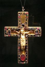 | Keywords: StServatius-Treasury5.jpg en The so-called pectoral cross of Saint Servatius in the church treasury of the Basilica of Saint Servatius Maastricht Netherlands Front gold on wood with cloisonné enamel plaques a Roman gem and precious stones around an ivory corpus Trier ±1039 probably a gift from emperor Henry III own Kleon3 Servatiana in the Treasury of Sint-Servaasbasiliek 11th-century sculptures in the Netherlands Crucifixion in jewellery 11th-century ivory Cloisonné of Europe Reliquaries of the True Cross 11th-century metalwork Crosses in jewellery |