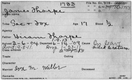 | Keywords: Student Information Card for Jim Thorpe - NARA - 595341.jpg Scope and content The card gives the student name sex tribe dates entered and left school parents names and age at entrance date General notes 595341 Local identifier Department of the Interior Office of Indian Affairs Carlisle Indian School 1879 - 1918 Archives I Reference Section Textual Archives Services Division NWCT1R National Archives Building 7th and Pennsylvania Avenue NW Washington DC 20408 Record group Record Group 75 Records of the Bureau of Indian Affairs 1793 - 1999 Record group ARC 404 Student Records compiled 1879 - 1918 Series ARC 300327 File unit Jim Thorpe Student File 1904 - 1915 File unit ARC 595333 Variant control numbers Other Identifier 09230<br /> This is the NARA Internal Exhibit Tracking Number for the Public Vaults exhibit Other versions <gallery> File Student_Information_Card_for_Jim_Thorpe_-_NARA_-_595341 tif tif File Student_Information_Card_for_Jim_Thorpe_-_NARA_-_595341 jpg jpg </gallery> NARA-cooperation PD-USGov Jim Thorpe Student identity cards |