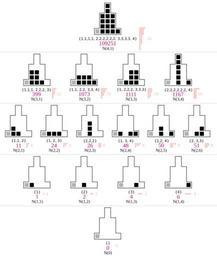 Keywords: Subgroups of Z2^4; digit weights in equivalence classes.svg v Subgroups of nimber addition Z24 The equivalence classes can be defined by multisets of their positive digit weights <br> They correspond to some integer partitions denoted by their index in A194602 shown in violet <br> Compare right column in this table The higher indices are taken from https //oeis org/A194602/a194602 txt this table where the values are +1 The 1 4 6 4 1 pattern in the vertices is from Pascal's triangle the 1 4 6 4 1 pattern of the whole structure is from A076831 own Mate2code Subgroups of nimber addition Binomial coefficients Integer partitions Cc-zero