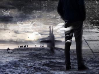 Keywords: submarine manschaft men sea water sky clouds weather wave forward mood rain downpour water splashes silhouette war harmony large powerful stormy human atmosphere