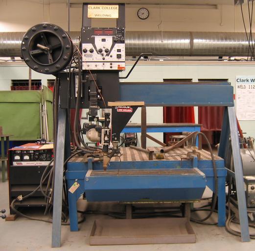 Keywords: Submerged arc welder.lincoln.triddle.jpg Submerged arc welding Welding equipment Triddle A Lincoln Submerged Arc Welding machine The blue support structure for this machine stands 56 in 1 4 m tall 68 in 1 7 m wide and 80 in 2 m deep The copper colored wire going from the top of the machine to the middle is 1/8 in 3 mm steel welding electrode The welder utilizes a 600 amp CC/CV welding power supply pictured on the left Meta This photograph was taken inside the Clark College welding lab See Also Close-up of the control panel