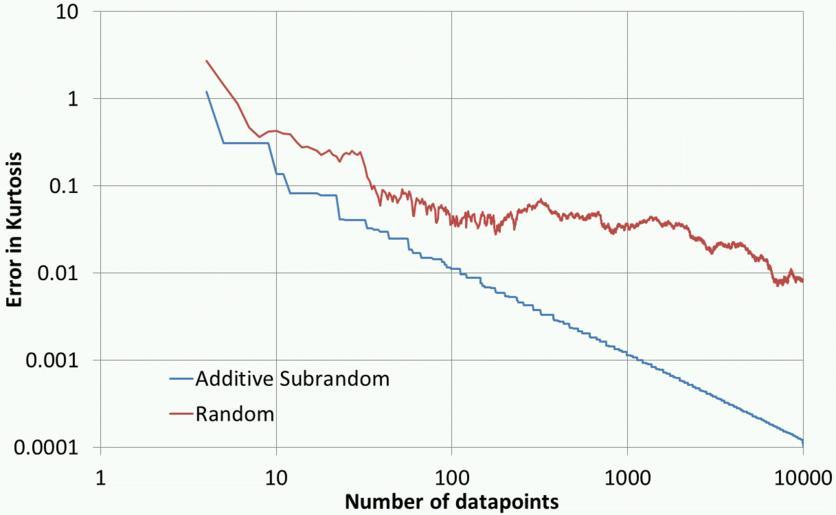| Keywords: Subrandom Kurtosis.gif en Error in estimated kurtosis as a function of number of datapoints 'Additive subrandom' gives the maximum error when c sqrt 5 -1 /2 'Random' gives the average error over six runs of random numbers where the average is taken to help smooth out fluctuations own Mollwollfumble 2011-04-05 Check categories 2011 April 6 en wikipedia Subrandom_numbers 2 Randomness Number theory | ||||