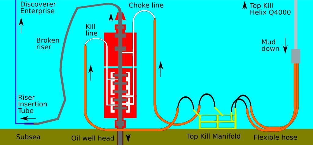 | Keywords: Subsea blowout preventer stack riser mud.svg en Schematic illustration of a subsea blowout preventer stack installed on the seabed with a riser insertion tube in place at the left and kill and choke lines connected to a top kill mud manifold on the right Legend red represents the blowout preventer stack grey represents the oil flow passage white tubing represents the kill left and choke right lines brown represents the top of the subsea well casing the five grey rectangles within the lower red shape represent ram-type blowout preventers the two grey rectangles within the upper red shape represent annular-type blowout preventers the orange pipes are flexible hoses connected to various rigid pipes Own illustration created with approximate reference to the following sources http //www offshore-mag com/index/article-display/323550/articles/offshore/equipment-engineering/us-gulf-of-mexico/cameron-wins-evo-subsea-bop-stack-contract html BP technical briefing linked at http //www offshore-mag com/index/article-display/5210928327/articles/offshore/deepwater-horizon/deepwater-horizon14 html Kent Wells technical update video linked at http //bp concerts com/gom/kentwells_update24052010 htm especially the illustration at time 6 54 BBC diagram at http //news bbc co uk/2/hi/world/us_and_canada/10159626 stm Economist diagram at http //media economist com/images/images-magazine/2010/21/ST/201021STC294 gif Using Inkscape 0 47 2010-05-27 User 84user thumb left Subsea blowout preventer stack with top kill mud lines shown unattached thumb left stack with top kill mud lines attached thumb left stack set up for a top kill plus riser insertion tube thumb left stack in top kill mode plus riser insertion tube and kill mud manifold thumb 480px left large context diagram showing both sea surface and subsea validSVG http //validator w3 org/check uri Created with Inkscape Oceanographic diagrams Blowout preventers Deepwater Horizon oil spill |
