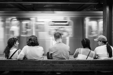 Keywords: subway metro man woman lonely alone reading book broadway new york manhattan nyc black and white american flag stars and stripes train station motion move tube traffic public transportation transport platform