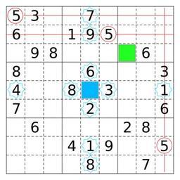 | Keywords: Sudoku-scan-and-count.svg This Sudoku graph is modificated from the Cross-hatching svg Cross-hatching svg 50 2012-11-27 21 22 UTC Cross-hatching svg Tim Stellmach derivative work Wikipit sudoku-scan-and-count svg Cross-hatching svg <b>en </b> This modification illustrates two methods for solving not only the cross hatching scan than the counting too I have drawn the graph in Libre Office and exported to svg <b>Content </b> 1 Scan Search for any number e g 5 On the red lines are further 5 forbidden In the upper right block the <i>only free position</i> for the 5 is the green place 2 Count For the blue field check all numbers between 1 and 9 in line and column blue marked The <i>only free number</i> is 5 for this field de Dieses Mustersudoku is eine Abwandlung von Cross-hatching svg Diese Modifikation illustriert zwei Lösungsmethoden nicht nur das Sichten scan wie in Cross-hatching svg sondern auch das Durchzählen Ich habe diese Grafik eigenhändig in Libre Office gezeichnet und dann nach svg exportiert <b>Inhaltserklärung </b> 1 Sichten Nimm eine häufige Ziffer z B 5 Auf den roten Linien Zeilen und Spalte sind weitere 5 verboten Die <i>einzige freie Position</i> im oberen rechten Block für eine 5 ist somit das grün markierte Feld 2 Durchzählen von Kandidaten Für das blau markierte Feld in der Mitte scheiden alle bereits vorgegebenen Ziffern in der Zeile und Spalte aus alle blau eingerahmt Die <i>einzige verbliebene Zahl</i> ist 5 sie ist für dieses Feld die Lösung Sudoku |