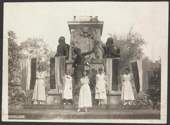 | Keywords: Suffrage protestors burn speech by President Wilson 160002v.jpg Summary Photograph of National Woman's Party members demonstrating with banners in front of the Lafayette Statue Jessie Benton MacKaye speaking second from left no banner wearing sash Cropped version of the photograph published in The Suffragist 6 no 36 Sept 28 1918 6 Participating in the pageant were Lucy G Branham Julia Emory Bertha Arnold Katherine Morey Elizabeth Kalb and Jessie Benton MacKaye 1 photograph print 5 x 7 in accession number Call Number Location National Woman's Party Records Group I Container I 160 Folder Lafayette Statue Demonstrations 1918-19 Source Collection Records of the National Woman's Party institution Library of Congress Manuscript Division LOC-image mnwp 160002 PD-Harris-Ewing Suffragettes from the United States Julia Emory Lucy Gwynne Branham General Lafayette Statue Washington D C September 1918 in Washington D C Demonstrations and protests in Washington D C |
