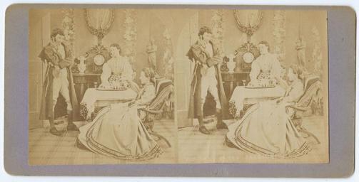 | Keywords: stereographs tea sugar parlors genre stereographs genrestereographs sketch drawing photo border illustration Genre stereograph showing two women and a man having tea in a parlor. One woman sits in a chair in front of the tea service, her hand hovering above a sugar pot. The other, younger woman stands behind the table, looking toward the handsome young man who faces them. Accession number: P.2011.47.1521a Genre stereograph showing two women and a man having tea in a parlor. One woman sits in a chair in front of the tea service, her hand hovering above a sugar pot. The other, younger woman stands behind the table, looking toward the handsome young man who faces them. Accession number: P.2011.47.1521a |