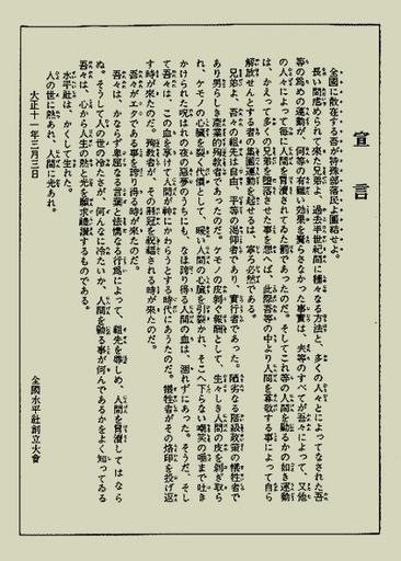 Keywords: Suiheisha declaration.jpg en Suiheisha declaration ru Декла ация общества «Суйхэйся» uk Декла ація това иства «Суйхейся» uk wikipedia org 1922 Author PD-old Taishō era