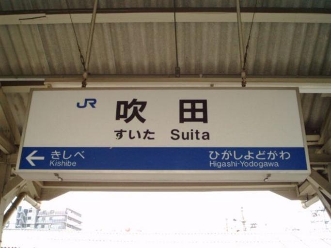 Keywords: Suita Sta Name.JPG en Station Name of Suita Station Photograpy Nozomikobe/4 Jun 2006 ja 吹田駅の駅名標 撮影 Nozomikobe/4 Jun 2006 2006-06-05 own assumed Nozomikobe Suita Station JR West