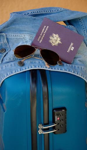 Keywords: suitcase departure travel passport sunglasses