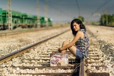 Keywords: suitcase person happy calm young soledad landscape hold on train vias station railway
