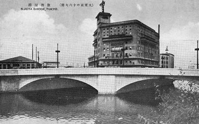 Keywords: Sukiya bashi old.jpg 絵葉書 大 京の十六大橋 PD-Japan-oldphoto Black and white photographs of bridges Stone arch bridges in Japan Road bridges in Tokyo Black and white photographs of Japan