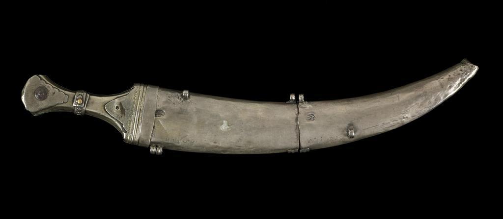 Keywords: Sulayman Salih - Thuma - Walters 511451 - Back.jpg The sheath is created from two pieces each with a buckle at the end and several loops on the side and back for attaching it to the girdle The front of the sheath is decorated with an arabesque leaves and tendril pattern The blade is fixed in the wooden handle with two pins which end in round decorative plaques made from coins Between the two plaques is a rhombic-shaped element on a band which closes at the back The back of both parts of the sheath have each an Arabic stamp with the date nusfi 1267; nusfi means half This date belongs either to the reign of al-Mutawakkil Ali AH 1267 or al-Mansur Ahmad AH 1266-1267 An engraved Hebrew inscription names the silversmith Sulayman Salih mahasit The term mahasit means half 1267 AH/AD 1850-1851 silver with gilding and wood Overall L 22 1/16 x W 16 1/8 in 56 x 41 cm ; L of blade 11 x W of blade 18 7/8 in 28 x 48 cm accession number 51 1451 80932 Mr Benjamin Zucker Zucker Family Trust and Mr Derek Content New York and London by purchase Walters Art Museum Joint gift to the Walters Art Museum Baltimore and the Israel Museum Jerusalem by Mr Benjamin Zucker and Mr Derek Content in honor of Mrs Barbara Zucker and Mrs Amanda Content 2010 Stamp Arabic nusfi 1267 Engraving Hebrew Sulayman Salih mahasit place of origin between Taizz and Sana'a Walters Art Museum license Weapons in the Walters Art Museum South Arabian art in the Walters Art Museum Sulayman Salih Media contributed by the Walters Art Museum needs category review |