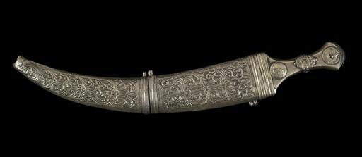 | Keywords: Sulayman Salih - Thuma - Walters 511451.jpg The sheath is created from two pieces each with a buckle at the end and several loops on the side and back for attaching it to the girdle The front of the sheath is decorated with an arabesque leaves and tendril pattern The blade is fixed in the wooden handle with two pins which end in round decorative plaques made from coins Between the two plaques is a rhombic-shaped element on a band which closes at the back The back of both parts of the sheath have each an Arabic stamp with the date nusfi 1267; nusfi means half This date belongs either to the reign of al-Mutawakkil Ali AH 1267 or al-Mansur Ahmad AH 1266-1267 An engraved Hebrew inscription names the silversmith Sulayman Salih mahasit The term mahasit means half 1267 AH/AD 1850-1851 silver with gilding and wood Overall L 22 1/16 x W 16 1/8 in 56 x 41 cm ; L of blade 11 x W of blade 18 7/8 in 28 x 48 cm accession number 51 1451 80932 Mr Benjamin Zucker Zucker Family Trust and Mr Derek Content New York and London by purchase Walters Art Museum Joint gift to the Walters Art Museum Baltimore and the Israel Museum Jerusalem by Mr Benjamin Zucker and Mr Derek Content in honor of Mrs Barbara Zucker and Mrs Amanda Content 2010 Stamp Arabic nusfi 1267 Engraving Hebrew Sulayman Salih mahasit place of origin between Taizz and Sana'a Walters Art Museum license Weapons in the Walters Art Museum South Arabian art in the Walters Art Museum Sulayman Salih Media contributed by the Walters Art Museum needs category review |