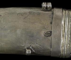 | Keywords: Sulayman Salih - Thuma - Walters 511451 - Mark A.jpg The sheath is created from two pieces each with a buckle at the end and several loops on the side and back for attaching it to the girdle The front of the sheath is decorated with an arabesque leaves and tendril pattern The blade is fixed in the wooden handle with two pins which end in round decorative plaques made from coins Between the two plaques is a rhombic-shaped element on a band which closes at the back The back of both parts of the sheath have each an Arabic stamp with the date nusfi 1267; nusfi means half This date belongs either to the reign of al-Mutawakkil Ali AH 1267 or al-Mansur Ahmad AH 1266-1267 An engraved Hebrew inscription names the silversmith Sulayman Salih mahasit The term mahasit means half 1267 AH/AD 1850-1851 silver with gilding and wood Overall L 22 1/16 x W 16 1/8 in 56 x 41 cm ; L of blade 11 x W of blade 18 7/8 in 28 x 48 cm accession number 51 1451 80932 Mr Benjamin Zucker Zucker Family Trust and Mr Derek Content New York and London by purchase Walters Art Museum Joint gift to the Walters Art Museum Baltimore and the Israel Museum Jerusalem by Mr Benjamin Zucker and Mr Derek Content in honor of Mrs Barbara Zucker and Mrs Amanda Content 2010 Stamp Arabic nusfi 1267 Engraving Hebrew Sulayman Salih mahasit place of origin between Taizz and Sana'a Walters Art Museum license Weapons in the Walters Art Museum South Arabian art in the Walters Art Museum Sulayman Salih Media contributed by the Walters Art Museum needs category review |