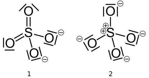 Keywords: Sulfate covalent-ionic.svg en Two representations of the sulfate ion <br />1 with polar covalent bonds only 2 with an ionic bond own Wickey-nl 2011-01-30 Sulfate ion
