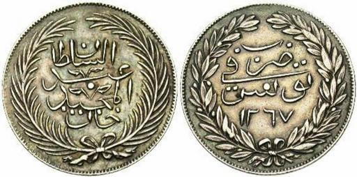Keywords: Sultan Abdelmajid Khan coin.jpg fr Rial tunisien frappée à Tunis durant le règne du sultan Ottoman Abdelmajid Khan 1267 Hégire 1851 AD Tunisie Own DrFO Jr Tn 2008 Tunisian rial coins