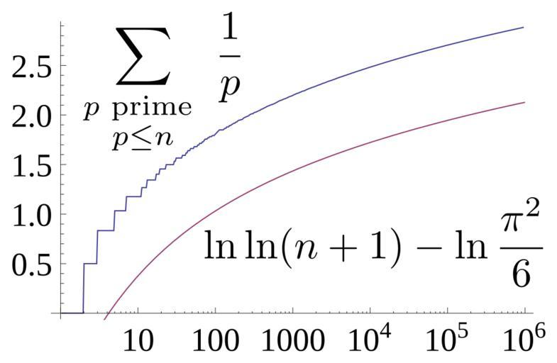 MAKE A MEME View Large Image Sum of reciprocals of primes.svg en A plot showing the sum of the reciprocal of the primes growing without bound The x axis is <math>n</math> and is logarithmic labelled in evenly spaced powers of 10 going up to 10<sup>6</sup> A loose but ...