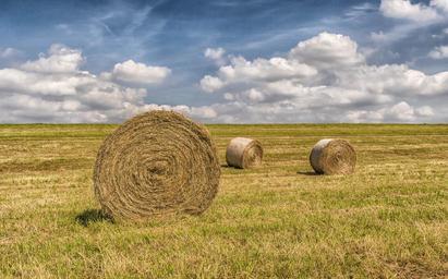 Keywords: summer harvest straw field stubble straw bales agriculture sky blue clouds roll fragrance hay