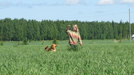 Keywords: summer hay girl and dog man dog blue sky finnish countryside clouds green sky