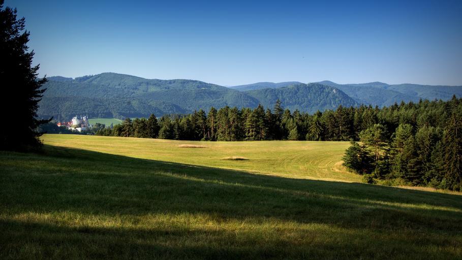 Keywords: summer morning landscape view sun trees meadow shading slovakia scenery nature