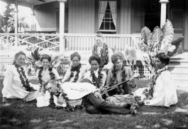 | Keywords: Summer vacation, Hāna, Maui, 1902.jpg en Summer vacation Hāna Maui 1902 Lydia K Aholo is four from the left Ida Pope sitting on chair and Ida's sister Katherine Pope holding the guitar H C Ovenden British bookkeeper for Heeia Sugar Plantation on grass in front Photograph unknown Courtesty of Bishop Museum Bonura Sandra; Witmer Sally 2013 Lydia K Aholo Her Story Recovering the Lost Voice The Hawaiian Journal of History Honolulu Hawaiian Historical Society 47 133 hdl 10524/36266 OCLC 60626541 Author ~ 1902 PD-old Lydia Kaʻonohiponiponiokalani Aholo Ida May Pope 1902 in Hawaii Hana Hawaii Photographs in the Bernice Pauahi Bishop Museum |