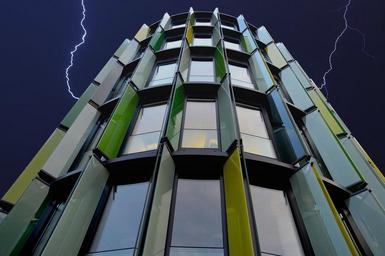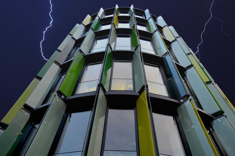 Keywords: summer weather building construction skyline sunscreen facade cologne rhine harbor skyscraper floors window office building thunderstorm gewitterstimmung