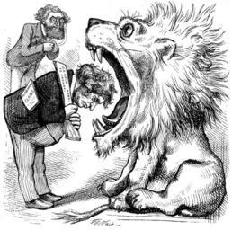 | Keywords: Sumner Lion.png en Charles Sumner puts his head in the gaping mouth of a lion while holding papers relating to the investigation that U S violated its neutral obligations by selling arms to France during the Franco-Prussian War of 1870 In his pocket are papers relating to U S claims against Great Britain for violating its neutral obligations by outfitting privateers during the Civil War Alabama claims Carl Schurz looks on anxiously in the background Harper's Weekly Creator Thomas Nast March 9 1872 p 200 Caption PUTTING HIS HEAD IN THE BRITISH LION'S MOUTH Why did he seek this counsel It was to prove that our Government had violated its neutral obligations to Germany to embroil us in a diplomatic difficulty with that Power and to prejudice our own case with the tribunal at Geneva by showing that we sinned as gravely against Germany as England sinned against us in the time of the Rebellion ” N Y Herald Feb 21 1872 PD-old-100 Caricatures of Carl Schurz Charles Sumner Thomas Nast 1872 in the United States 1872 cartoons 1870s political cartoons of the United States Drawings of lions People with lions in art |